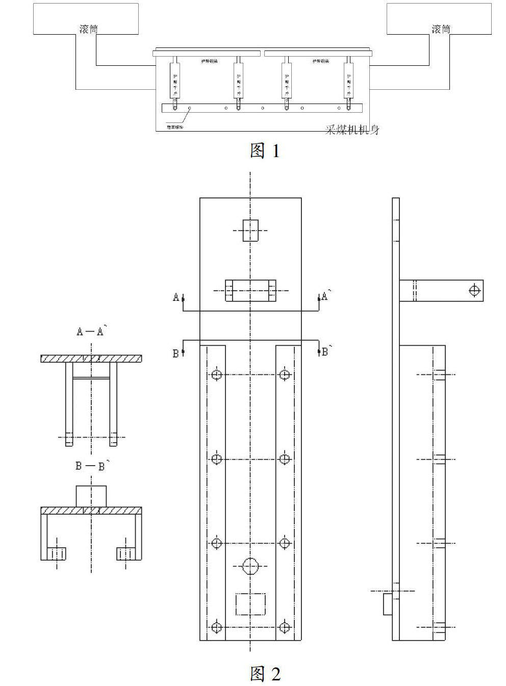 加工2組可調(diào)式護(hù)幫架,利用采煤機(jī)機(jī)身現(xiàn)有螺栓和銷(xiāo)軸,固定在采煤機(jī)機(jī)身上面(如圖1),護(hù)幫架由護(hù)幫千斤頂、導(dǎo)向槽、護(hù)幫梁組成(如圖2),護(hù)幫時(shí),利用采煤機(jī)的高壓水,控制護(hù)幫千斤頂活塞桿的伸縮,帶動(dòng)護(hù)幫梁擠壓煤壁,護(hù)幫梁與煤壁之間加設(shè)大、小柈,增加護(hù)幫面積,從而達(dá)到護(hù)幫的目的。采煤機(jī)作業(yè)時(shí),護(hù)幫架隨著采煤機(jī)移動(dòng),不需要人工搬運(yùn),實(shí)現(xiàn)了機(jī)載,護(hù)幫架對(duì)采煤機(jī)司機(jī)操作采煤機(jī)沒(méi)有影響,對(duì)采煤機(jī)正常運(yùn)行沒(méi)有影響。