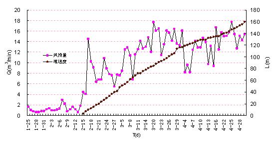 ??? 從圖 2 曲線可以看出,自工作面剛開始形成到開采前,風(fēng)排瓦斯涌出量平均為1.16m3/min,隨著工作面開始向前推進(jìn),工作面風(fēng)排瓦斯涌出量增大到4.40m3/min,此時(shí)的瓦斯涌出量可以認(rèn)為是本煤層瓦斯涌出量;當(dāng)回采推進(jìn)到15m左右時(shí),工作面頂板初次來(lái)壓,7-2煤上幅煤以及距7-2煤33m左右的下鄰近層9煤等鄰近層瓦斯涌入工作面,工作面風(fēng)排瓦斯涌出量急劇增大,正常開采期間,2~4月S5-709工作面的平均風(fēng)排瓦斯涌出量為12.40m3/min。