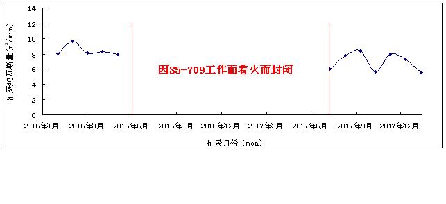 在S5-709工作面回采期間,尤其是回采未受保護(hù)區(qū)域時(shí),工作面瓦斯涌出較大。此時(shí)進(jìn)行瓦斯道抽采(采用Φ300mm高濃管路),有效地解決了上隅角瓦斯超限問(wèn)題,保證了工作面的正?;夭?。其抽采瓦斯抽采隨推進(jìn)時(shí)間變化曲線見圖4,從頂板瓦斯道抽采統(tǒng)計(jì)數(shù)據(jù)來(lái)看,2016年2~5月份瓦斯道抽采量較大,抽采純量8.09~9.68m3/min,平均抽采純量為8.53m3/min,即瓦斯道抽采對(duì)治理采空區(qū)瓦斯涌出起到了至關(guān)重要的作用。