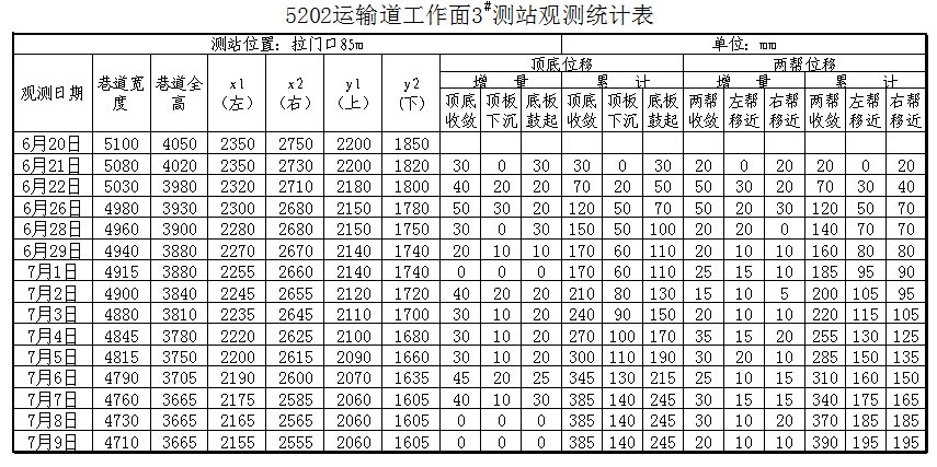 ? 5202 運輸?shù)缹嵤┥羁仔秹?、淺孔爆破掘進技術后,在一定程度上,對煤層頂板進行了有效預裂,使頂板壓力提前轉(zhuǎn)移釋放,在減少工作面輔助作業(yè)時間,提高掘進速度的同時,有效的控制了工作面“煤炮”發(fā)生的頻率。以 5202 運輸?shù)?/span> 3# 觀測站觀測數(shù)據(jù)為例,工作面“煤炮”從未卸壓之前的三十多響減至七、八響,甚至不響,頂板周下沉量從 50 ~ 60mm 減至 10 ~ 20mm 之間,底板周鼓起量從 100 ~ 110mm 減至 40 ~ 50mm 之間,兩幫周收斂量從 140 ~ 160mm 減至 20 ~ 40mm 之間,平均循環(huán)進尺提高 0.8m 左右,單月進尺從 135m 提高到 187m ,達到了工作面快速、安全掘進的目的。