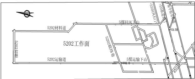新安煤礦位于華亭礦區(qū)安口—新窯煤田,屬中生界侏羅系下統(tǒng)隱伏煤田。 5202 運輸?shù)牢挥诰锉币?span lang="EN-US">5煤采區(qū),西側(cè)與5204設計工作面相鄰,東側(cè)5煤采區(qū)邊界(采區(qū)邊界外有1204采空區(qū)),北為礦井北邊界,南為+535m水平回風石門及運輸石門,工作面位置如圖1所示。工作面掘進范圍內(nèi)煤巖層整體為北高南低的單斜構造, 煤層埋藏較深, 巷道煤巖層走向9~12?、傾角0~16?,煤層厚度5~14m,平均厚度8.0m。工作面地表標高約+1250m,拉門口標高+446m,距離地表垂深達800m左右。 根據(jù)K1鉆孔資料,工作面上覆巖層,距5#煤層50m位置發(fā)育有35m厚的灰白色細砂巖,結構致密,成份以長石、石英為主,局部含白色粗砂巖。