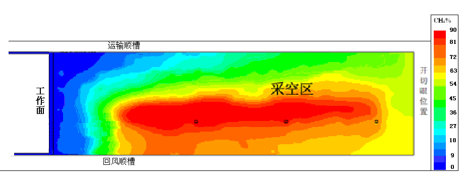 采空區(qū)內(nèi)的瓦斯分布、運(yùn)移取決于采空區(qū)內(nèi)部的風(fēng)流運(yùn)動(dòng)規(guī)律、瓦斯擴(kuò)散運(yùn)動(dòng)規(guī)律及瓦斯上浮運(yùn)動(dòng)規(guī)律的綜合作用。瓦斯?jié)舛仍诓煽諈^(qū)內(nèi)形成一種相對穩(wěn)定的動(dòng)態(tài)平衡的濃度梯度,從切頂線往采空區(qū)深部方向及底板往頂部裂隙帶方向瓦斯?jié)舛葷u漸變大,在采空區(qū)內(nèi)存在一個(gè)等濃度的曲面梯度。采空區(qū)瓦斯分布如圖2所示。