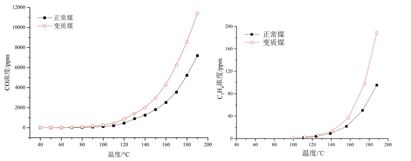 由表 4 實驗室測定不同變質(zhì)程度的煤樣自燃傾向性指標參數(shù)可以看出,原生煤與變質(zhì)煤均為Ⅰ類容易自燃煤層; 30 ℃煤的吸氧量表現(xiàn)為原生煤大于變質(zhì)煤;但在反應(yīng)溫度達到 70 ℃時,變質(zhì)煤對于氧氣的消耗速率大于原生煤;結(jié)合衡量溫升速率快慢的交叉點溫度指標,體現(xiàn)為變質(zhì)煤較原生煤加速氧化階段的氧化自燃特性更強烈;計算煤氧化動力學綜合指標判定指數(shù)表明火成巖侵入破壞使得變質(zhì)煤較原生煤具有更高的自然發(fā)火的風險。由圖 2 對比分析可以看出變質(zhì)煤較原生煤在低溫氧化階段標志性氣體產(chǎn)出溫度低,變現(xiàn)了變質(zhì)煤更易發(fā)火的實踐經(jīng)驗。