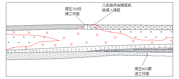 如圖 4 ,在南五 709 回采過程中工作面遇到火成巖沿煤層底板侵入煤體時,揭露的構(gòu)造體向工作面涌入瓦斯,造成回風斷電中斷生產(chǎn),統(tǒng)計發(fā)現(xiàn)在停產(chǎn)面風排瓦斯量增加 4m3/min 。與其同向推進的南五 903 掘進工作面在施工底板錨索時,鉆孔位于火成巖床體內(nèi)時發(fā)生瓦斯噴出,造成回風斷電中斷生產(chǎn),統(tǒng)計發(fā)現(xiàn)風排瓦斯量增加 4m3/min 。巖漿在侵入過程中,破壞地層同時也在冷卻收縮易形成賦存瓦斯的裂隙,巖床下煤層受熱烘烤作用,瓦斯向上運移、富集在多孔的火成巖床內(nèi),采煤和打鉆作業(yè)破壞了蓋儲條件,對瓦斯富集區(qū)形成“天窗”出口,從而瓦斯大量異常涌出。
