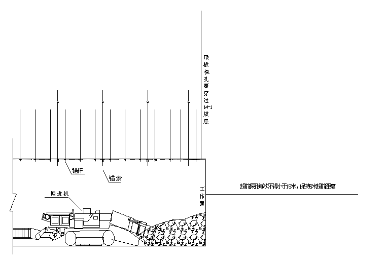 由于復(fù)雜的地質(zhì)條件,采取每10m頂板施工一個垂直探孔,掌握準備14-1煤層準確位置,巷道距14-1煤層底板7~10m,切實做好層位管理。同時由于該工作面有斷層出現(xiàn),避免因斷層影響誤穿煤層,垂直工作面迎面施工1~3個超前探孔,每個探孔不得小于15m,始終保持5m超前距,防止誤揭煤。