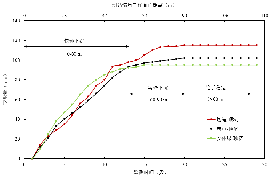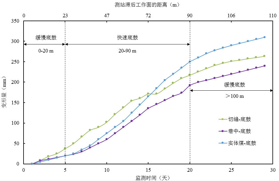 1、滯后工作面110m,頂板壓力和頂板變形趨于穩(wěn)定,但巷道持續(xù)底鼓嚴(yán)重,巷道總變形仍未穩(wěn)定。