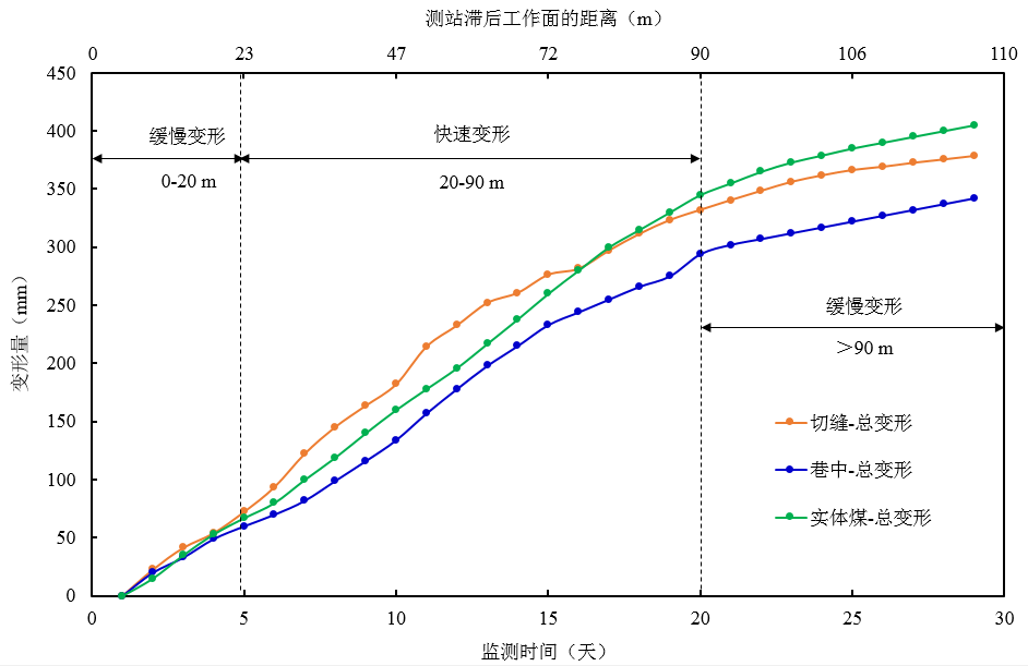 (3)綜合來(lái)看, 巷道頂?shù)装迨諗孔冃未笾驴煞譃槿齻€(gè)階段:第一個(gè)階段為架后約0-20 m,此段內(nèi)基本頂發(fā)生彎曲下沉,但尚未斷裂,底板巖體在端頭支架的約束下底鼓緩慢,因此,巷道總變形緩慢增加;第二階段為架后20-90 m,基本頂發(fā)生回轉(zhuǎn)斷裂,采空區(qū)矸石未壓實(shí),底部巖體在兩側(cè)支承應(yīng)力作用下發(fā)生底鼓,尤其是實(shí)體煤一側(cè)集中應(yīng)力較大,因此,巷道總變形快速增大;第三階段為架后90 m以后,采空區(qū)矸石逐漸壓實(shí),頂板下沉速度顯著降低,趨于穩(wěn)定,但是,巷道底部巖體仍為穩(wěn)定,持續(xù)發(fā)生緩慢底鼓,因此,巷道總變形仍緩慢進(jìn)行。