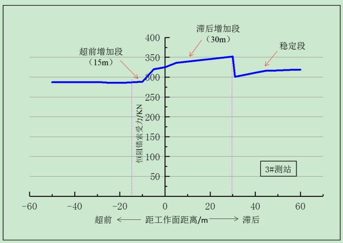 根據(jù)工作面推進(jìn)情況和錨索應(yīng)力計(jì)布置情況,選擇 3#測(cè)站恒阻錨索應(yīng)力監(jiān)測(cè)為典型監(jiān)測(cè)進(jìn)行分析。3#測(cè)點(diǎn)距留巷開(kāi)始位置50m,錨索應(yīng)力計(jì)的錨索受力變化曲線如圖2所示。