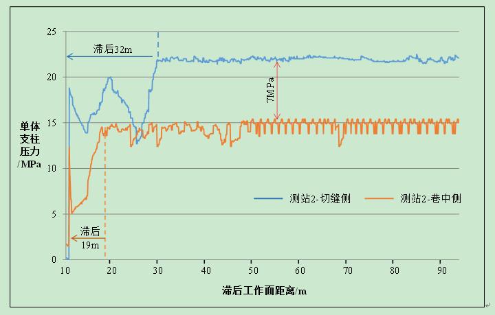 (2)切縫側(cè)滯后工作面 32m 之內(nèi),單體壓力出現(xiàn)波動(dòng),滯后工作面32m后穩(wěn)定在23MPa,分析原因是底鼓和頂板來(lái)壓多重因素的影響。巷中側(cè)單體壓力滯后工作面19m處時(shí)壓力穩(wěn)定,說(shuō)明巷中側(cè)單體壓力受頂板壓力影響小于切縫側(cè)單體。