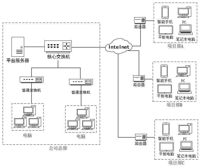 現(xiàn)階段光纖與4G網(wǎng)絡(luò)的覆蓋面很廣,項(xiàng)目部的網(wǎng)絡(luò)接入問題可以得到很好的保障。我們只需將平臺(tái)部署在公司總部的機(jī)房?jī)?nèi),分配專用服務(wù)器并配置外網(wǎng)IP,選定簡(jiǎn)單好記的專用域名,通過第三方平臺(tái)解析指向外網(wǎng)IP,讓員工可以通過域名訪問平臺(tái)。同時(shí),直接分配三層交換機(jī)的千兆端口與平臺(tái)服務(wù)器直連,保證平臺(tái)的訪問速度。系統(tǒng)部署的網(wǎng)絡(luò)拓?fù)鋱D見圖1。另外,將移動(dòng)端APP程序的下載連接部署在平臺(tái)首頁,讓員工可以通過二維碼掃描下載移動(dòng)端APP(僅Android)。這樣不論你在任何地方,只要有網(wǎng)絡(luò)即可訪問平臺(tái),參加學(xué)習(xí)及考試。