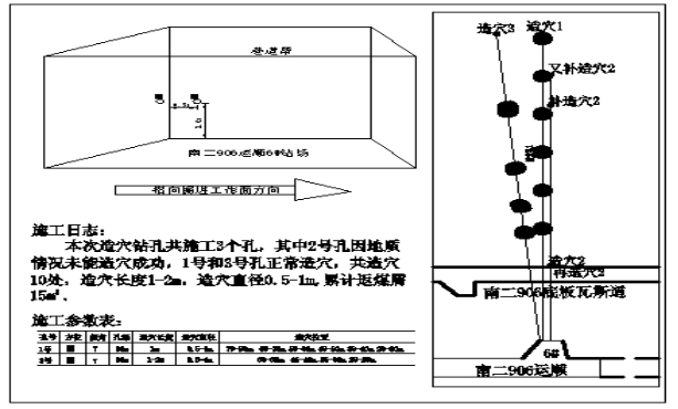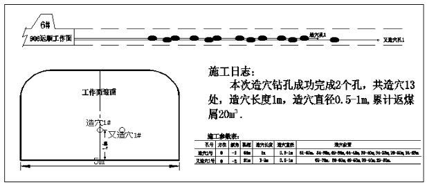 造穴鉆孔于3月31日四點班開始施工至4月1日四點班結束,施工期間大隆礦技術人員到現(xiàn)場指導,共成功施工造穴鉆孔2個。