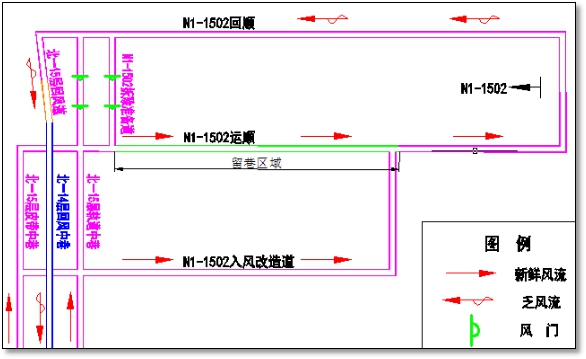 由于N1-1502工作面瓦斯涌出量較高,通過優(yōu)化通風(fēng)方式,留巷后將“兩入一回”調(diào)整為“一入兩回”,通風(fēng)方式由Y形通風(fēng)變?yōu)閃形通風(fēng)。在此基礎(chǔ)上,工作面推進后,首先在碎石幫噴射柔性快速密閉噴涂材料,待留巷變形穩(wěn)定后,再噴射混凝土漿液進行永久密閉。