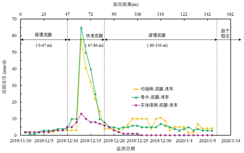 (1)第一階段,架后 0-47 m,緩慢底臌,底臌速率 3-10 mm/d。
