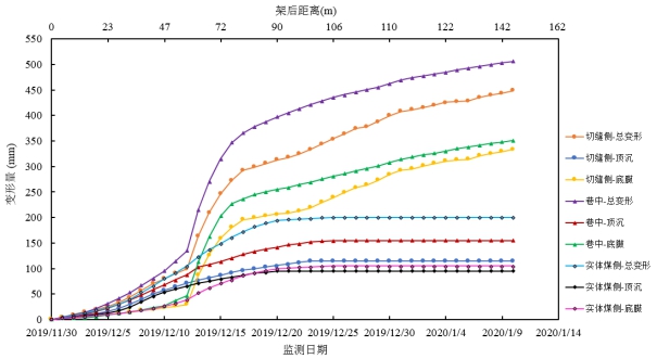 圖3為測站#1在不同的架后距離時,巷道不同變形內(nèi)容監(jiān)測曲線,包括實體煤側(cè)、巷道中、切縫側(cè)隨時間發(fā)展的頂?shù)装逡平?、頂板下沉量、底臌量?/p>