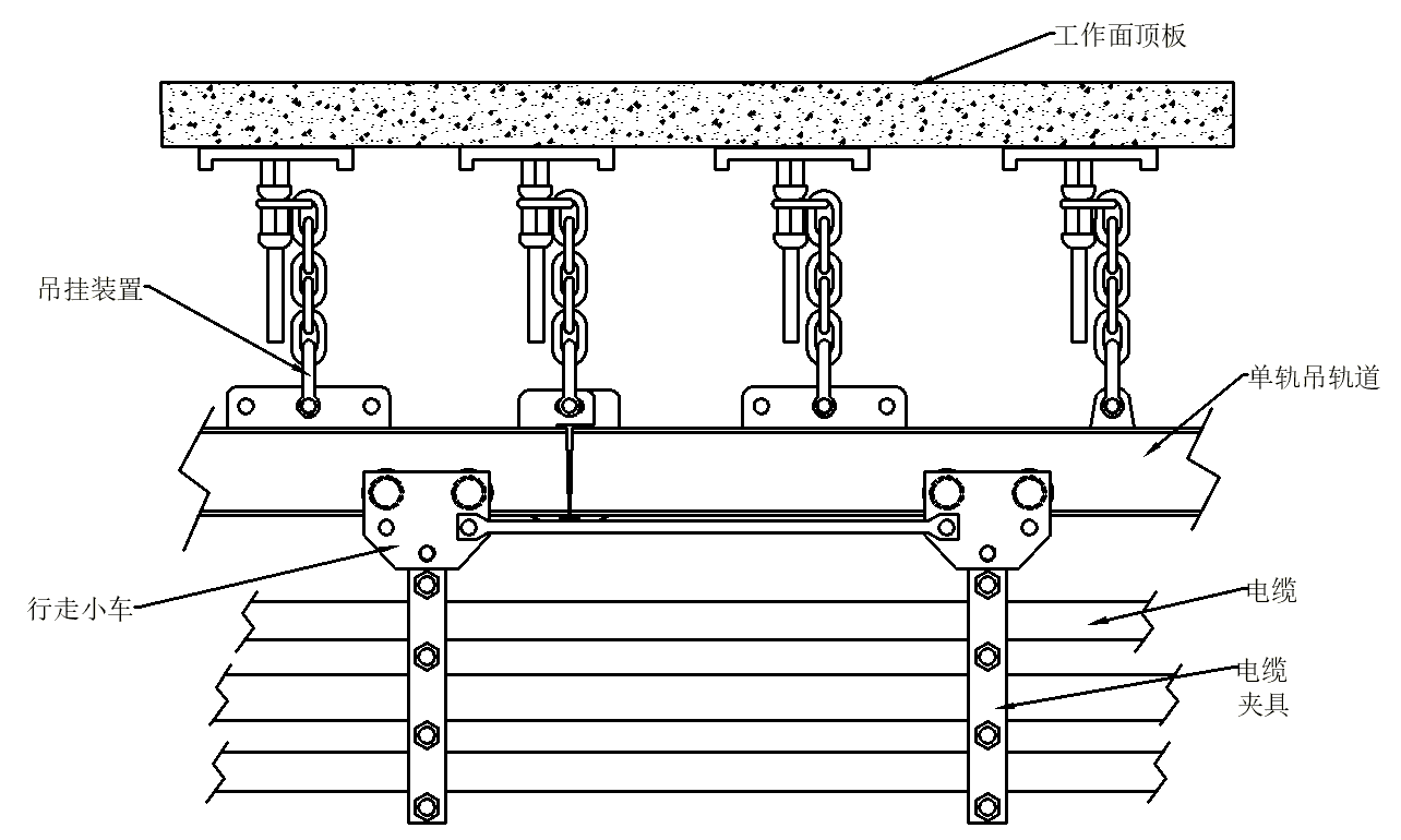 由于綜采工作面每回采30m左右,變電列車、供電電纜及液壓管線都必須隨綜采設(shè)備一起前移,以往移動電纜及管線采用慢速絞車進行牽引,電纜和管線在地面上拖拽,摩擦阻力很大,極易造成電纜磨損、拉斷等安全隱患。作業(yè)過程中還存在電纜及管線易出現(xiàn)扭結(jié)、套勁等問題,必須多人進行整理,造成作業(yè)人員勞動強度大,工作效率低。為了有效解決這些在生產(chǎn)過程中出現(xiàn)的實際問題,曉南礦經(jīng)過多次試驗和改進最終研制成功并定型應(yīng)用了“拖拉電纜單軌吊車”。該設(shè)備主要由軌道、行走小車、電纜夾具和吊掛裝置4個部分組成。“拖拉電纜單軌吊車”的研制與應(yīng)用,實現(xiàn)了井下綜采工作面電纜及液壓管線沿著順槽固定軌道與轉(zhuǎn)載機及變電列車同步移動的目的,降低了作業(yè)人員勞動強度,提高了工作效率。