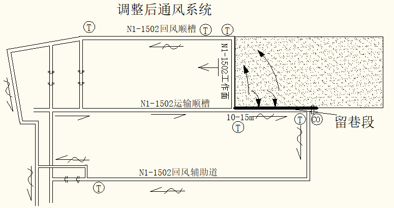 (2)在留巷生產(chǎn)實(shí)踐中發(fā)現(xiàn)由于運(yùn)順留巷段與回風(fēng)隅角壓差較大,工作面絕對(duì)瓦斯涌出量達(dá)到18m3/min,經(jīng)過(guò)研究探討調(diào)整為“一入兩回”通風(fēng)方式:N1-1502運(yùn)順入風(fēng),N1-1502回風(fēng)輔助道和回順回風(fēng)。同時(shí),N1-1502入風(fēng)改造道作為下一個(gè)工作面的軌道順槽,N1-1502運(yùn)輸順槽實(shí)施留巷作為下一個(gè)工作面的運(yùn)輸順槽,開采下個(gè)工作面前施工回風(fēng)順槽形成工作面完整的通風(fēng)系統(tǒng),確保一個(gè)工作面具有三條順槽,并每個(gè)工作面回采期間留巷一個(gè)順槽,從而實(shí)現(xiàn)無(wú)煤柱開采。如圖1.2 “110工法”調(diào)整后通風(fēng)系統(tǒng)圖。