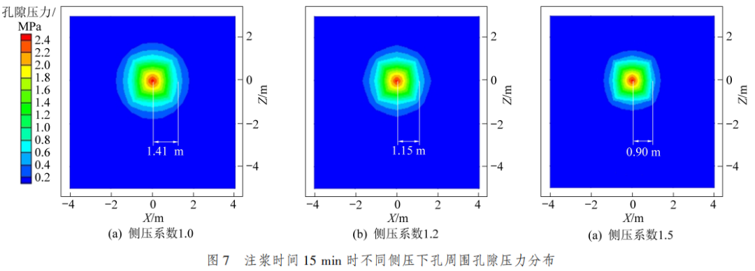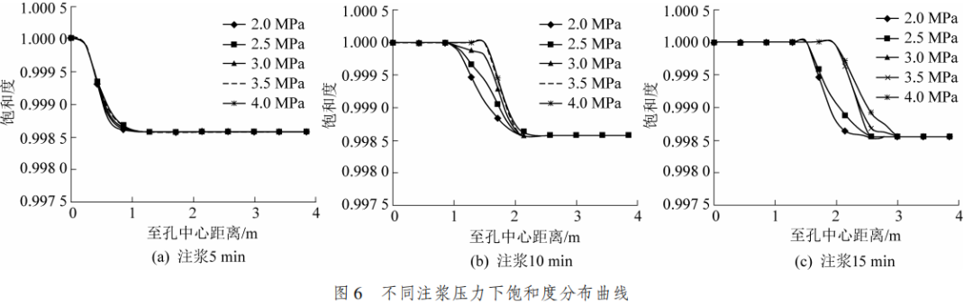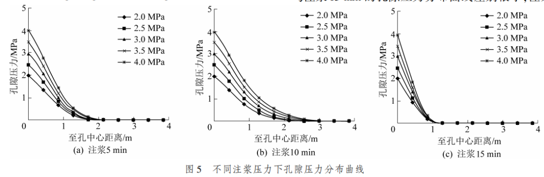 以此參數(shù)為基礎(chǔ),通過數(shù)值模擬試驗揭示了注漿孔周邊孔隙壓力分布與飽和度變化規(guī)律,分析了掘進(jìn)工作面不同應(yīng)力狀態(tài)對漿液擴(kuò)散的影響,對比了不同注漿壓力下孔隙壓力和飽和度分布曲線,發(fā)現(xiàn)應(yīng)力狀態(tài)對漿液最大擴(kuò)散半徑影響較小,提高注漿壓力能在一定時間段內(nèi)提高注漿效率,但并不能顯著提高漿液擴(kuò)散半徑。
