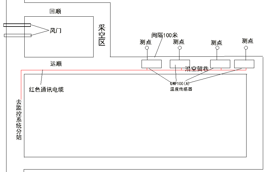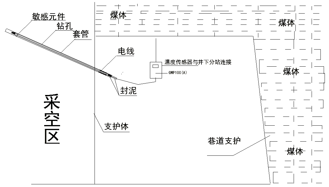 4.1.2利用溫度傳感器,對(duì)沿空留巷沿途每間隔100m進(jìn)行重點(diǎn)區(qū)域進(jìn)行檢測,確保數(shù)據(jù)準(zhǔn)確及可靠。采空區(qū)檢測點(diǎn)距支護(hù)巷道表面1.5-3.0m的區(qū)間。為監(jiān)測5-7m區(qū)間采空區(qū)溫度的變化(如有需要可加長檢測元件電纜的長度),將GWP100(A)型溫度傳感器的檢測元件加長連接線(采用4×1.5mm2礦用阻燃電纜)達(dá)10m,在使用前對(duì)傳感器檢測數(shù)據(jù)失真狀況進(jìn)行調(diào)試,對(duì)自然發(fā)火重點(diǎn)部位打孔徑為Φ15mm、深度達(dá)到采空區(qū)5-7m,埋入傳感器檢測元件,將傳感器聯(lián)入礦井安全監(jiān)控系統(tǒng),從而實(shí)現(xiàn)對(duì)煤層深部自然發(fā)火溫度的自動(dòng)、連續(xù)監(jiān)測,配合火情監(jiān)測系統(tǒng)測溫裝置,更好地實(shí)現(xiàn)預(yù)報(bào)自然發(fā)火的作用。