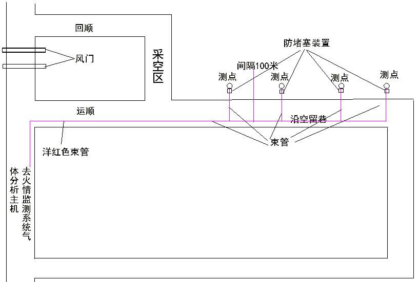 4.1.4利用火情監(jiān)測系統(tǒng)氣體分析主機(jī)對(duì)沿空留巷采空區(qū)的氣體進(jìn)行分析化驗(yàn)后將數(shù)據(jù)傳輸?shù)降孛婊鹎楸O(jiān)測系統(tǒng)中心站,并對(duì)數(shù)據(jù)進(jìn)行分析處理被告超限報(bào)警。在回風(fēng)留巷打孔,將束管穿過支護(hù),進(jìn)入采空區(qū)3到5m(如有需要可以根據(jù)實(shí)際情況加長束管的伸入長度),為防止束管口堵塞,管中要安設(shè)防堵塞裝置,當(dāng)CH4、CO、C2H2、O2?和CO2這幾種氣體中,CO、C2H2出現(xiàn)時(shí),說明采空區(qū)已有自燃發(fā)火現(xiàn)象。安裝方法見圖6所示。