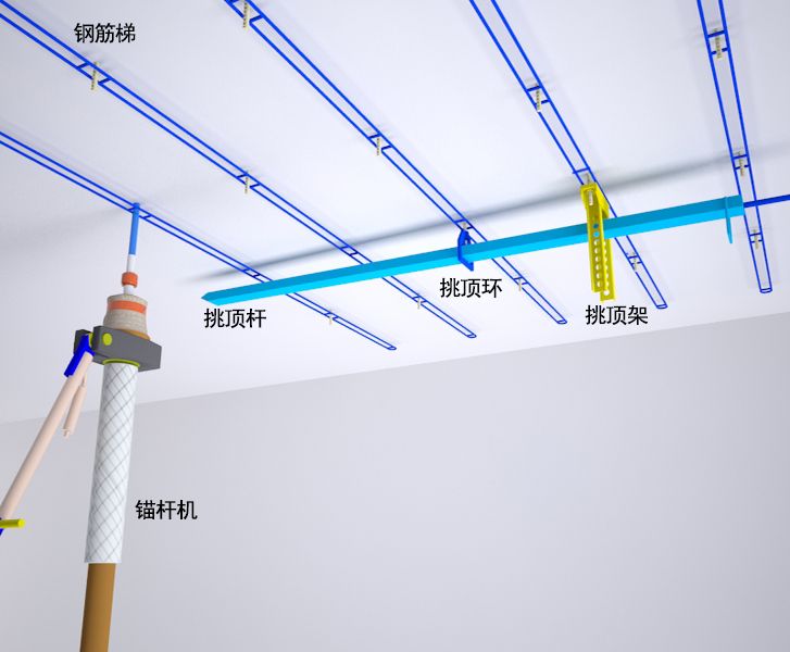 傳統(tǒng)的臨時支護,全過程均為人工操作,步驟較多,視頂板情況安設(shè)二套或三套挑頂架、挑頂桿、挑頂環(huán),來挑起鋼筋梯。此流程以下問題:對頂板沒有初撐力,屬于被動支護,安全可靠性差;流程十分繁瑣,需前后人員配合嫻熟,且易出現(xiàn)人身磕碰情況;挑頂桿與頂板為點接觸,挑頂縱深范圍僅為2m,不能完全貼合頂板。