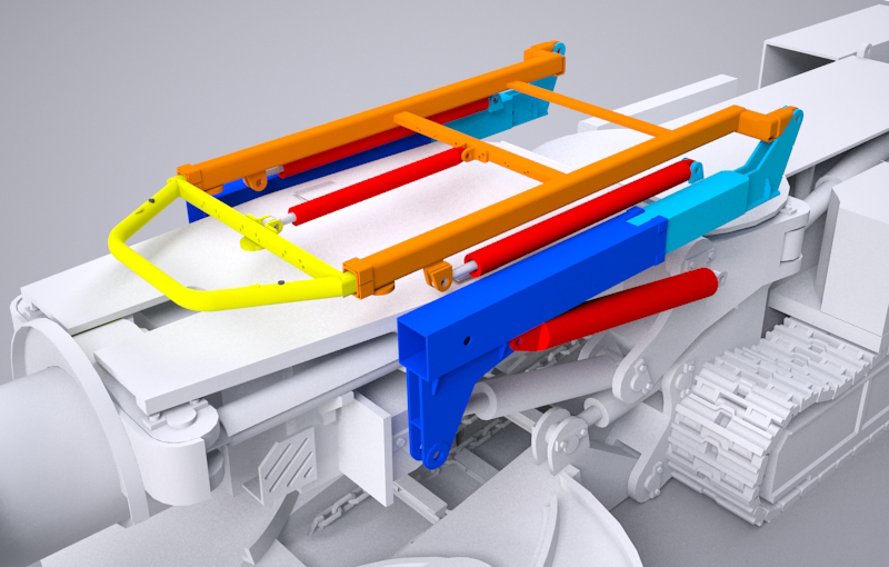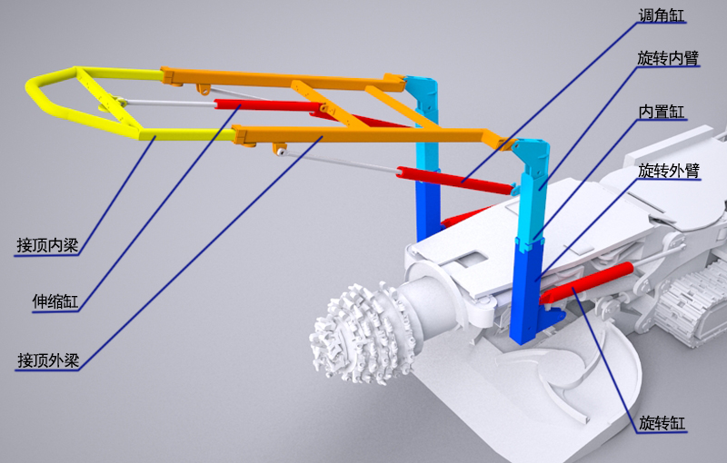 在掘進機作業(yè)時,機載支護是處于收縮折疊狀態(tài)的。為了不影響司機的操作視線,使其能夠盡量直觀的觀察截割頭截割情況。機載支護的高度應最大化的降低,避免司機因無法觀察到截割頭截割頂幫煤巖的情況,進而造成頂幫超挖和刮碰頂幫錨桿及錨網(wǎng)。兩側(cè)的調(diào)角缸位置是在旋轉(zhuǎn)臂正上方靠里側(cè)布置,折疊后,可讓出旋轉(zhuǎn)臂的空間,進一步下降高度;接頂外梁二側(cè)面方焊管的位置,是在調(diào)角缸正上方靠里側(cè)布置,折疊后,可讓出調(diào)角缸的空間,這樣可以有效的降低收縮折疊后的整體高度。