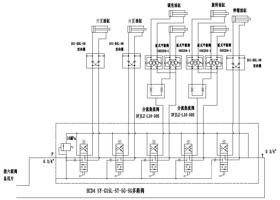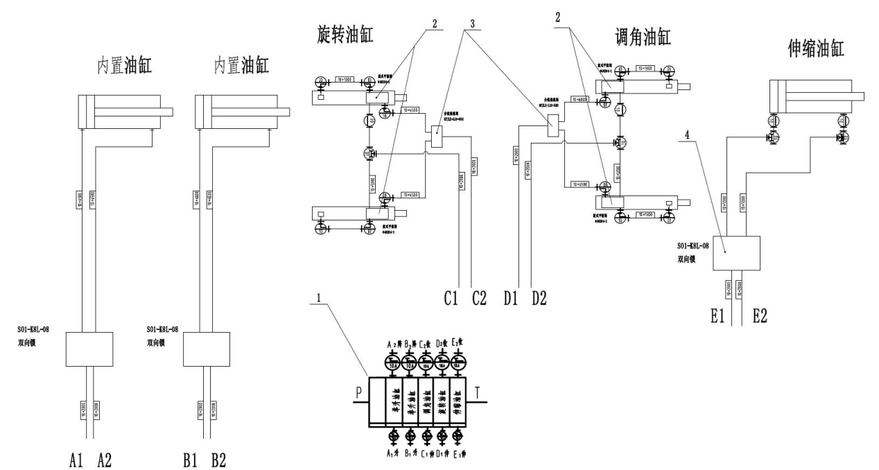 液壓結(jié)構(gòu)如圖4所示,分別由五聯(lián)閥組×1、分流集流閥×2、雙向鎖×3、板式平衡閥×4及各種膠管、接頭等組成。從掘進機聯(lián)閥組件取油,通過五聯(lián)閥組控制各缸體:二個內(nèi)置油缸分別由2片閥控制,實現(xiàn)旋轉(zhuǎn)內(nèi)臂的不同步升降,以滿足頂板不平時的情況;旋轉(zhuǎn)油缸由1片閥控制,實現(xiàn)旋轉(zhuǎn)臂的轉(zhuǎn)動,調(diào)角油缸由1片閥控制,實現(xiàn)接頂外梁的水平接頂,單伸縮油缸由1片閥控制,實現(xiàn)接頂內(nèi)梁的向前伸出。