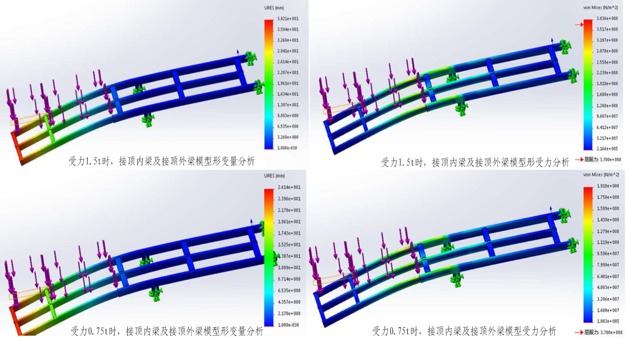 要在假定鉸接點穩(wěn)固不破壞的前提下,接頂內(nèi)梁完全伸出的狀態(tài)下,對受力1.5t和0.75t二種情況進行分析:
