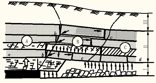 A—煤壁支撐影響區(qū)(a-b);B-離層區(qū)(b- c);C-重新壓實區(qū)(c- d)