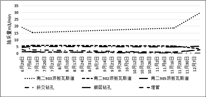 抽采日期 | 工作面涌出量m3/min | 南二903頂板瓦斯道m(xù)3/min | 南二902頂板瓦斯道m(xù)3/min | 南二905頂板瓦斯道m(xù)3/min | 斜交鉆孔m3/min | 順層鉆孔m3/min | 埋管m3/min | 風(fēng)排瓦斯量m3/min | 上隅角瓦斯最大值% |