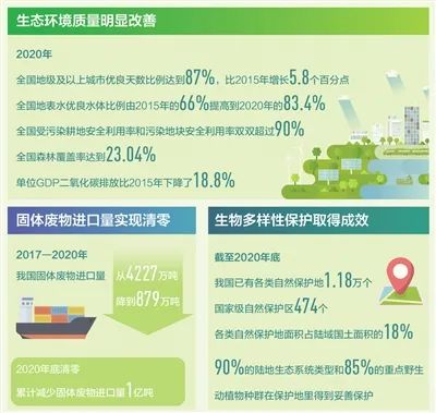 2020年,全國(guó)地級(jí)及以上城市優(yōu)良天數(shù)比例達(dá)到87%,比2015年增長(zhǎng)5.8個(gè)百分點(diǎn);PM2.5未達(dá)標(biāo)地級(jí)及以上城市平均濃度達(dá)到37微克/立方米,比2015年下降28.8%;全國(guó)地表水優(yōu)良水體比例由2015年的66%提高到2020年的83.4%,劣Ⅴ類水體比例由2015年的9.7%下降到了2020年的0.6%;全國(guó)受污染耕地安全利用率和污染地塊安全利用率雙雙超過90%;全國(guó)森林覆蓋率達(dá)到23.04%,自然保護(hù)區(qū)以及各類自然保護(hù)地面積占到陸域國(guó)土面積的18%;單位GDP二氧化碳排放比2015年下降了18.8%。