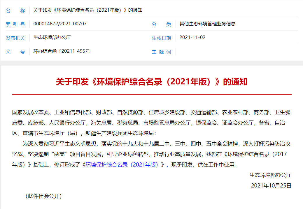 生態(tài)環(huán)境部印發(fā)《環(huán)境保護(hù)綜合名錄(2021年版)》