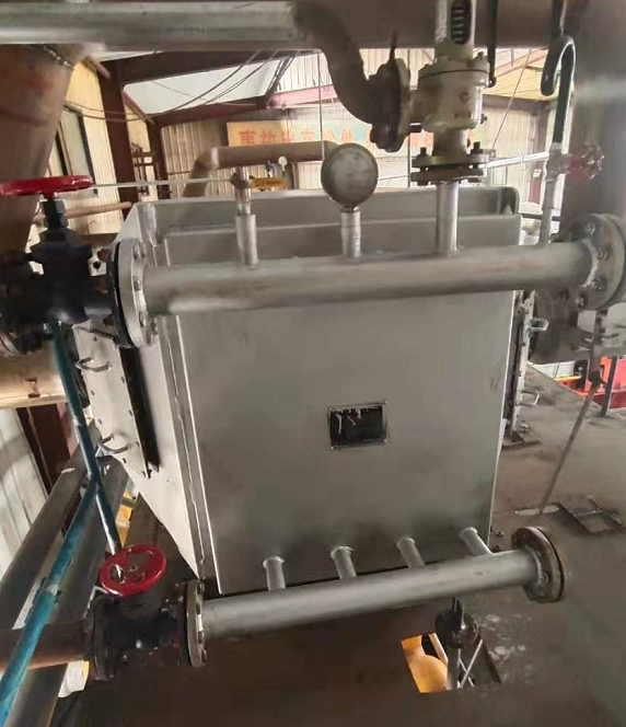 煙氣余熱回收裝置選用的是青島凱能鍋爐設(shè)備有效公司生產(chǎn)的KNPT系列針形管余熱回收裝置,是專為煙氣余熱回收而設(shè)計的專用高效節(jié)能產(chǎn)品。采用針形管強化傳熱元件擴展受熱面,水管煙側(cè)的受熱面可大大增加,同時煙氣流經(jīng)針形管表面時形成強烈的紊流,起到提高傳熱效率和減少煙灰積聚的作用。該余熱回收設(shè)備具有結(jié)構(gòu)簡單、熱效率高、運行壽命長、安全可靠、維護方便等優(yōu)點。高溫循環(huán)加熱系統(tǒng)工藝圖如圖4所示,余熱回收裝置實際安裝如圖5所示。