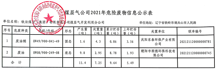 煤層氣公司2021年危險(xiǎn)廢物信息公示