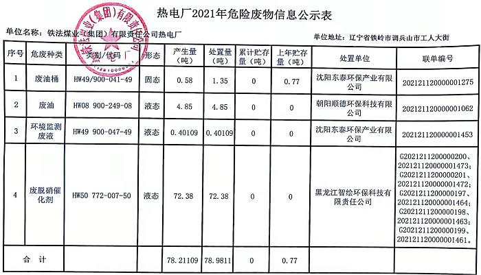 熱電廠2021年危險廢物信息公示