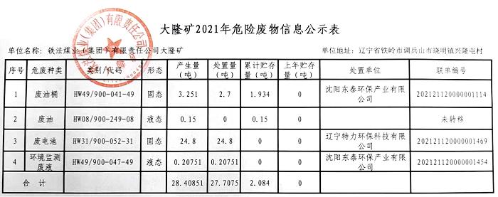 大隆礦2021年危險廢物信息公示