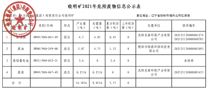 曉明礦2021年危險(xiǎn)廢物信息公示