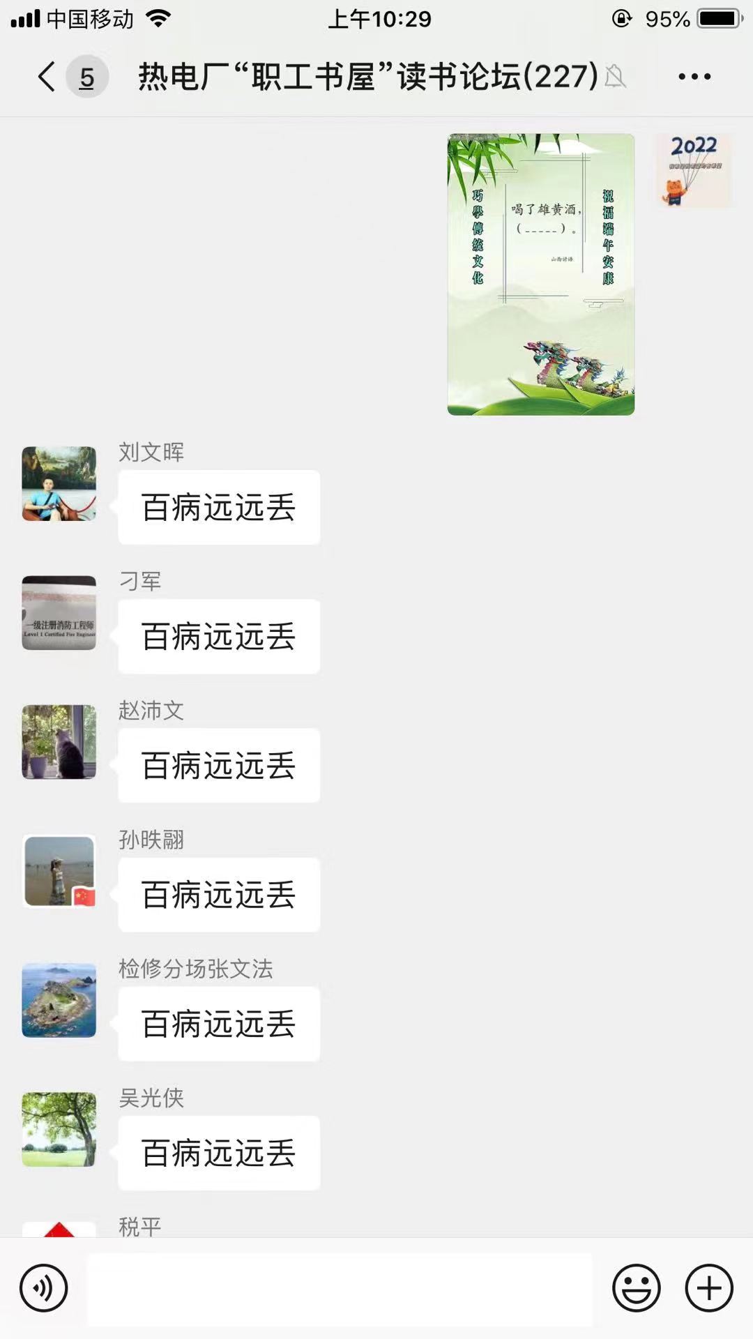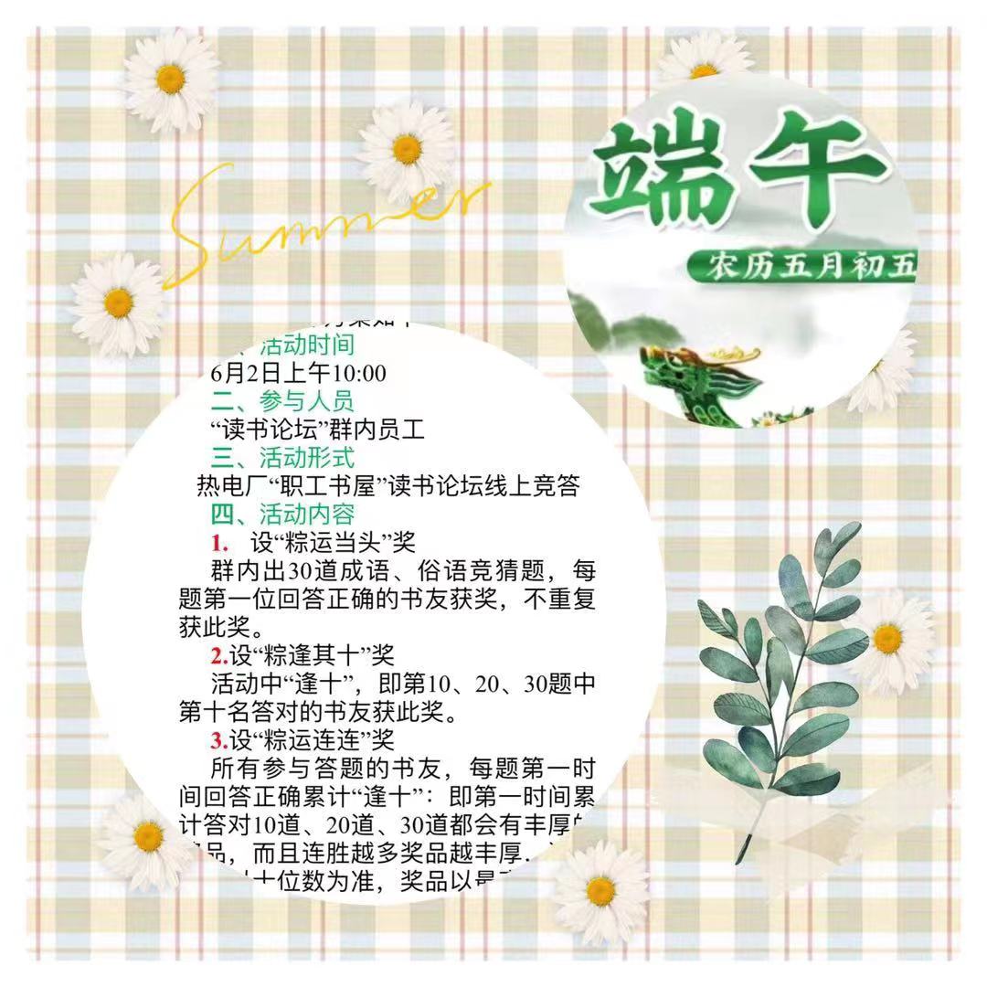 ? ? 6月2日,熱電廠工會職工書屋舉辦“祝福端午安康?巧學傳統(tǒng)文化”線上競答活動。本次活動由熱電廠讀書愛好者通過線上“職工書屋讀書論壇”方式參與活動,活動設有“粽運當頭”搶答獎,“粽逢其十”幸運獎,“粽運連連”實力獎?;顒又校蠹夷銧幬見Z,競爭激烈?;顒咏Y束后,職工們紛紛表示此次活動不僅考驗了他們的知識積累量,也繼承和弘揚了中國傳統(tǒng)文化。通過開展此次活動,將日常生活與傳承中華傳統(tǒng)文化有效結合,寓教于樂,使職工感受到節(jié)日的氛圍,也使職工了解了關于端午節(jié)的更多習俗,讓傳統(tǒng)節(jié)日深入人心,增強民族自豪感及文化認同感。
