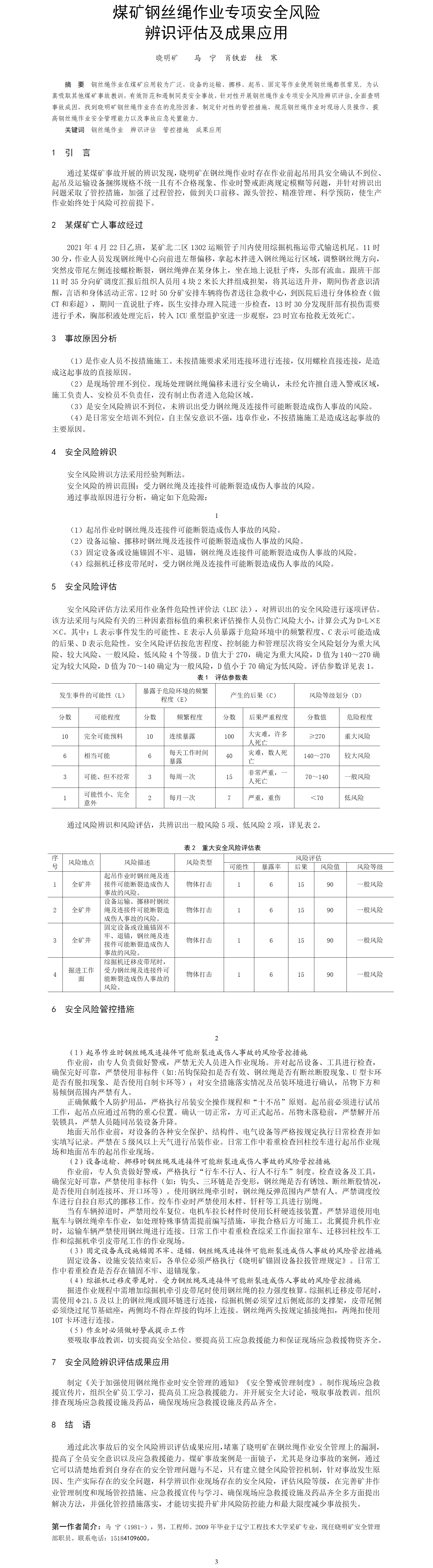 第54屆等級獎論文---煤礦鋼絲繩作業(yè)專項安全風險辨識評估及成果應用