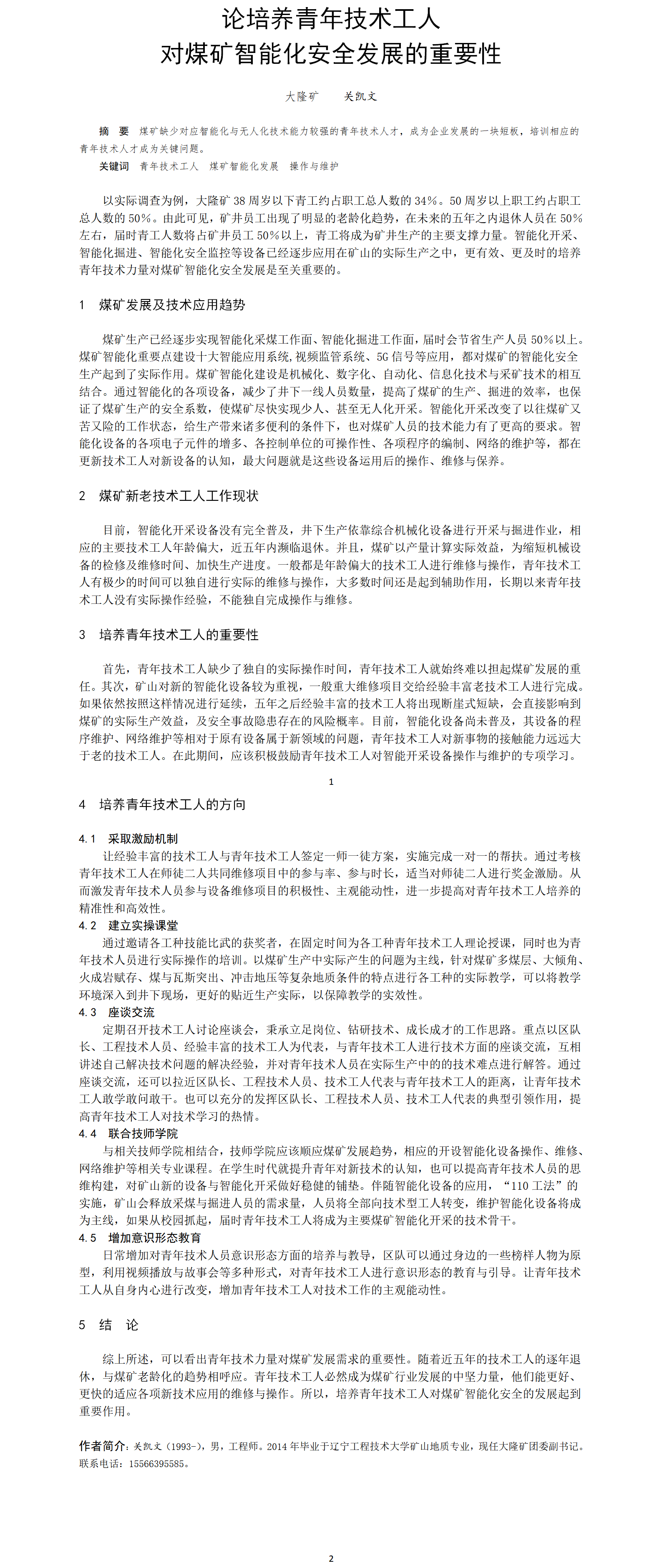 第54屆等級獎?wù)撐?--論培養(yǎng)青年技術(shù)工人對煤礦智能化安全發(fā)展的重要性