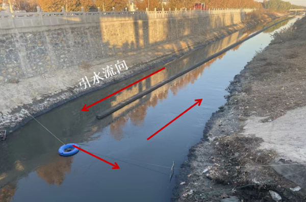 圖3 ?2023年12月5日,督察組現(xiàn)場督察發(fā)現(xiàn),南樂縣永順溝源頭段建有隔堤,引水回流稀釋河道受污染的河水