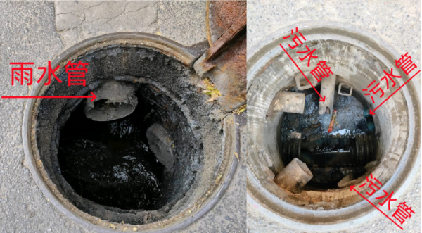 圖1 ?2023年12月6日,督察組現(xiàn)場督察發(fā)現(xiàn),西寧市排水管網(wǎng)雨污混流問題突出,左圖為污水井內(nèi)混接雨水管,右圖為雨水井內(nèi)混接污水管