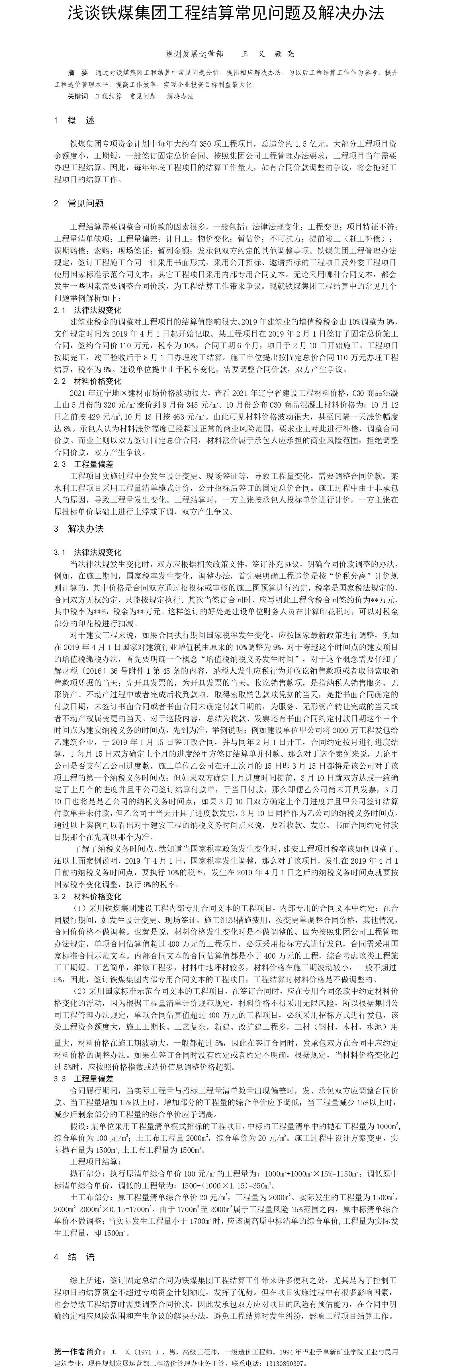 第55屆等級獎?wù)撐?--淺談鐵煤集團工程結(jié)算常見問題及解決辦法