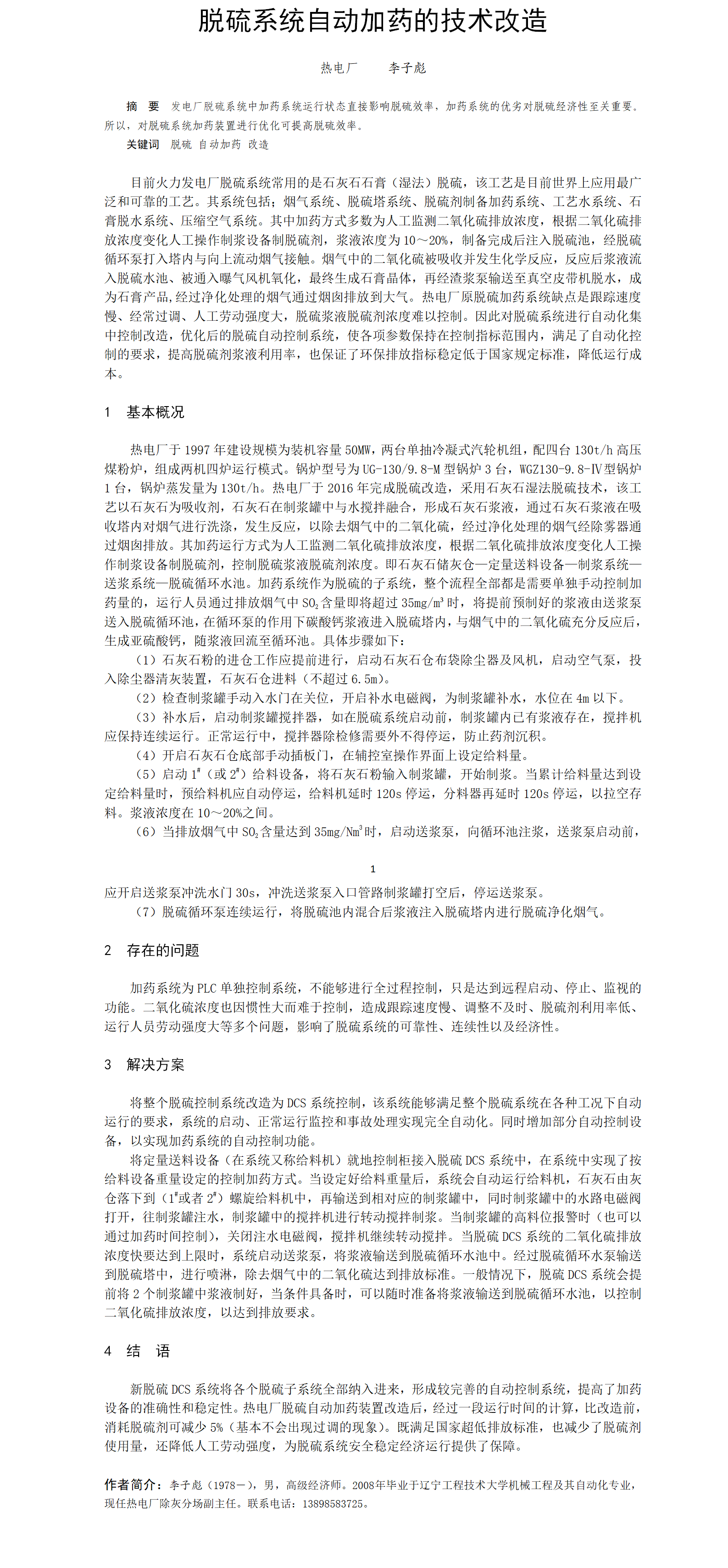第55屆等級(jí)獎(jiǎng)?wù)撐?--脫硫系統(tǒng)自動(dòng)加藥的技術(shù)改造