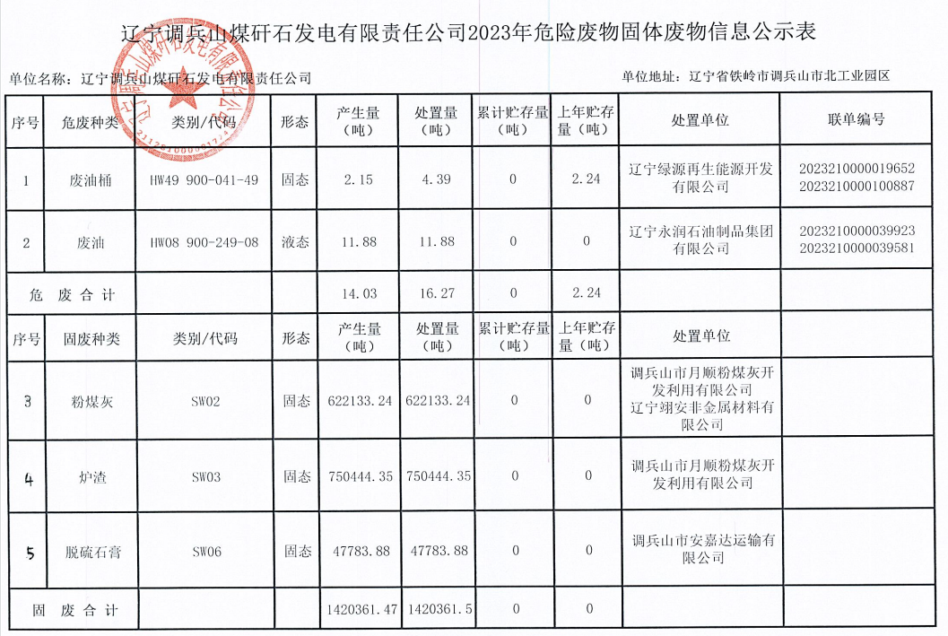 熱電廠2023年度固體廢物污染環(huán)境防治信息