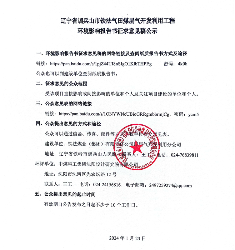 遼寧省調(diào)兵山市鐵法氣田煤層氣開(kāi)發(fā)利用工程環(huán)境影響報(bào)告書(shū)征求意見(jiàn)稿公示