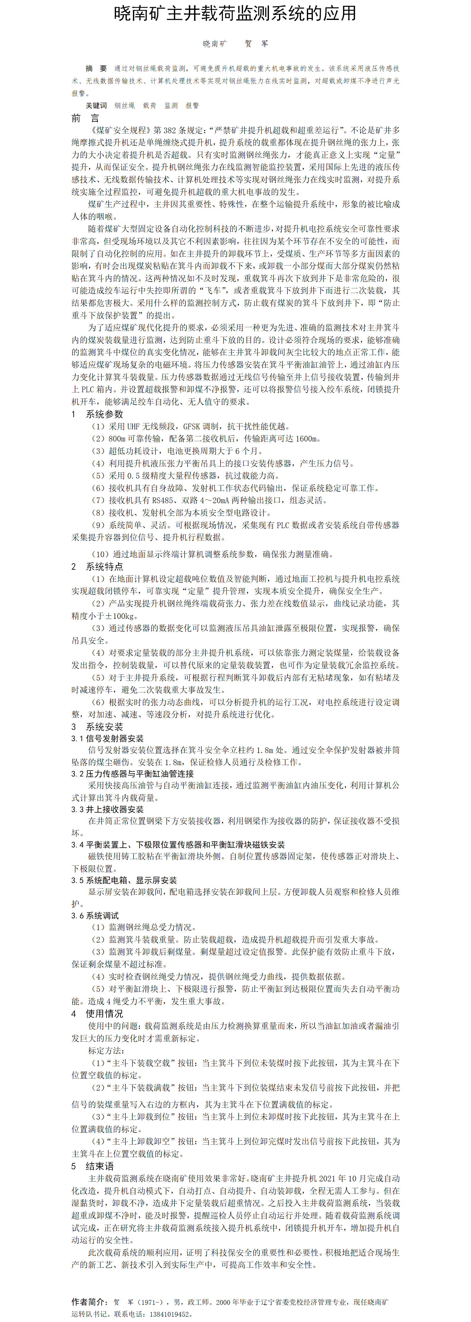 第56屆等級(jí)獎(jiǎng)?wù)撐?--曉南礦主井載荷監(jiān)測(cè)系統(tǒng)的應(yīng)用