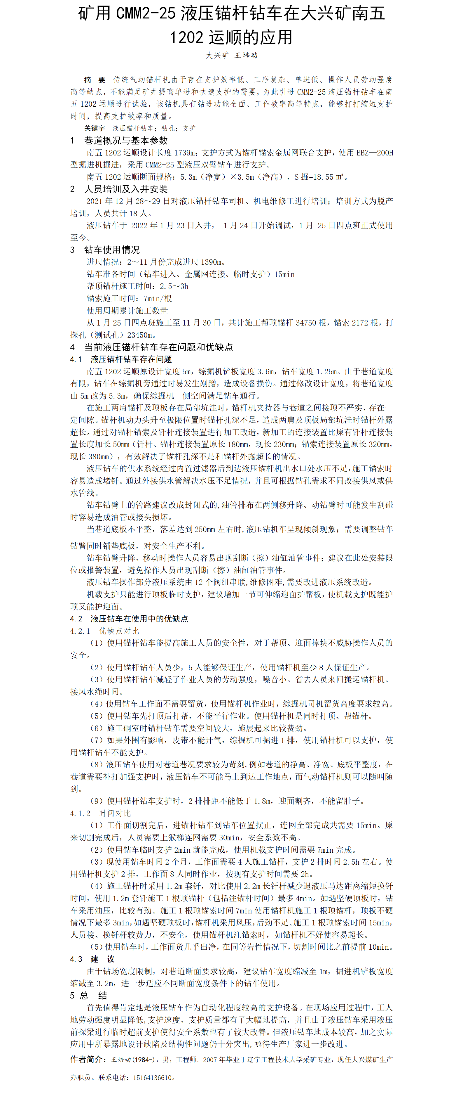 第57屆等級獎?wù)撐?--礦用CMM2-25液壓錨桿鉆車在大興礦南五1202運順的應(yīng)用