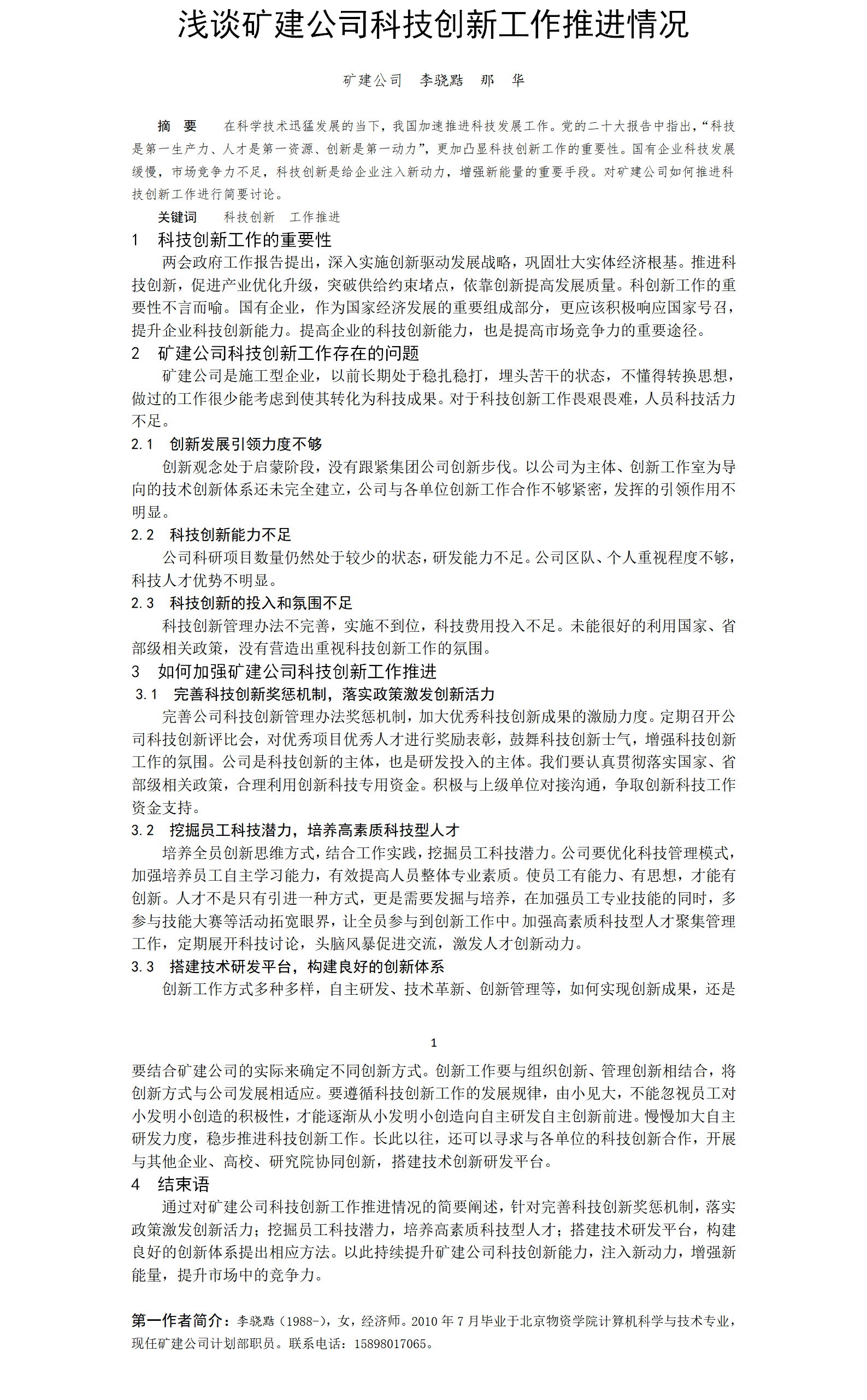 第58屆等級獎?wù)撐?--淺談礦建公司科技創(chuàng)新工作推進情況