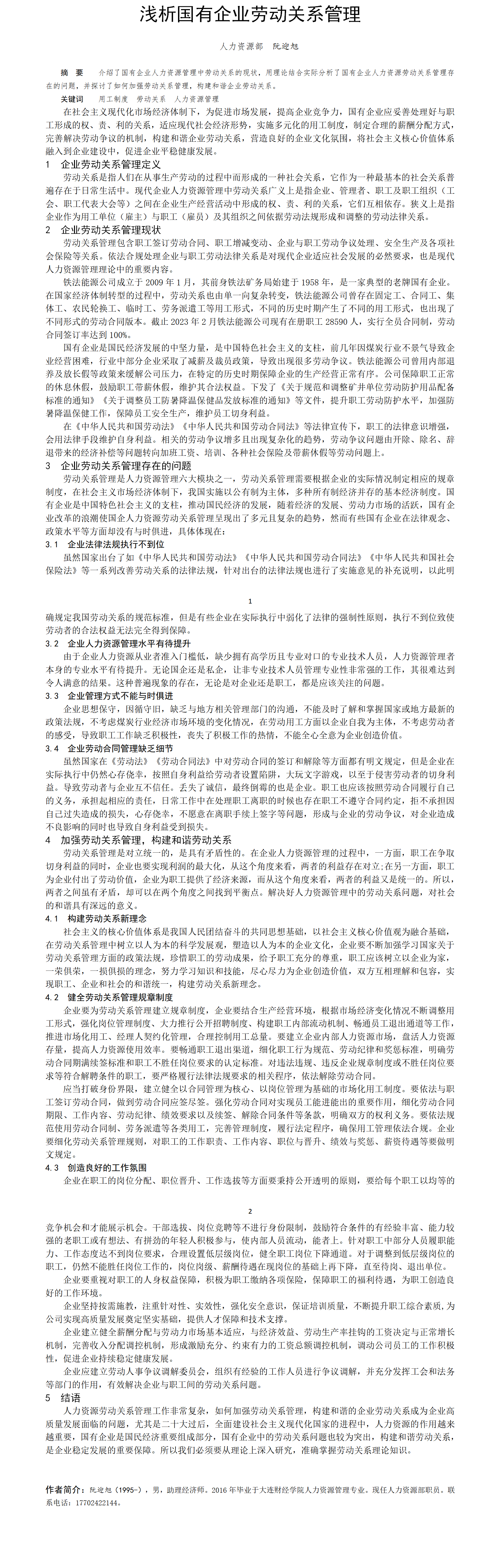 第58屆等級(jí)獎(jiǎng)?wù)撐?--淺析國(guó)有企業(yè)勞動(dòng)關(guān)系管理