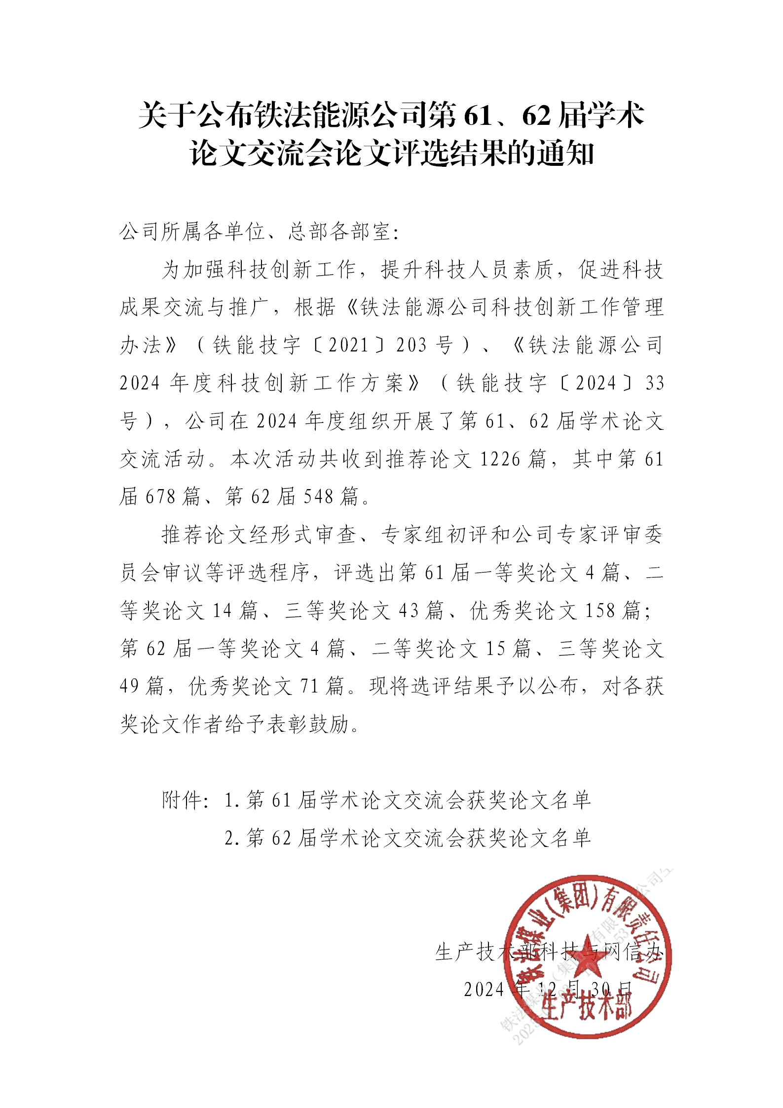 關(guān)于公布鐵法能源公司第61、62屆學(xué)術(shù)論文交流會(huì)論文評(píng)選結(jié)果的通知